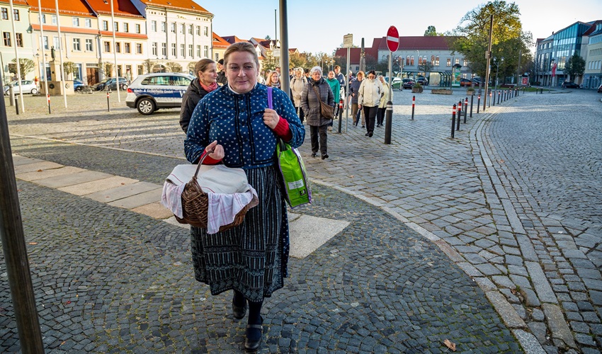 Stadtrundgang durch Lübben mit Spreewald-Christl in Niedersorbischer Tracht, wjeźenje pó měsće z Błośańskeju Christloweju w dolnoserbskej drastwje